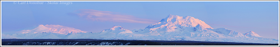 Here’s another shot of the Wrangell Mountains from my recent trip to the north side of Wrangell-St. Elias National Park. The 2 main peaks are Mt. Drum towards the right, and the broad based mound of Mt Wrangell on the left. The small cone shaped dome on the left, touching Mt Wrangell, is Mt. Zanetti. This is a panoramic composition, produced by stitching several tighter frames together using Photoshop – a pretty neat little tool that allows a variety of compositional options not as readily available to a standard 35mm SLR. Cool stuff.